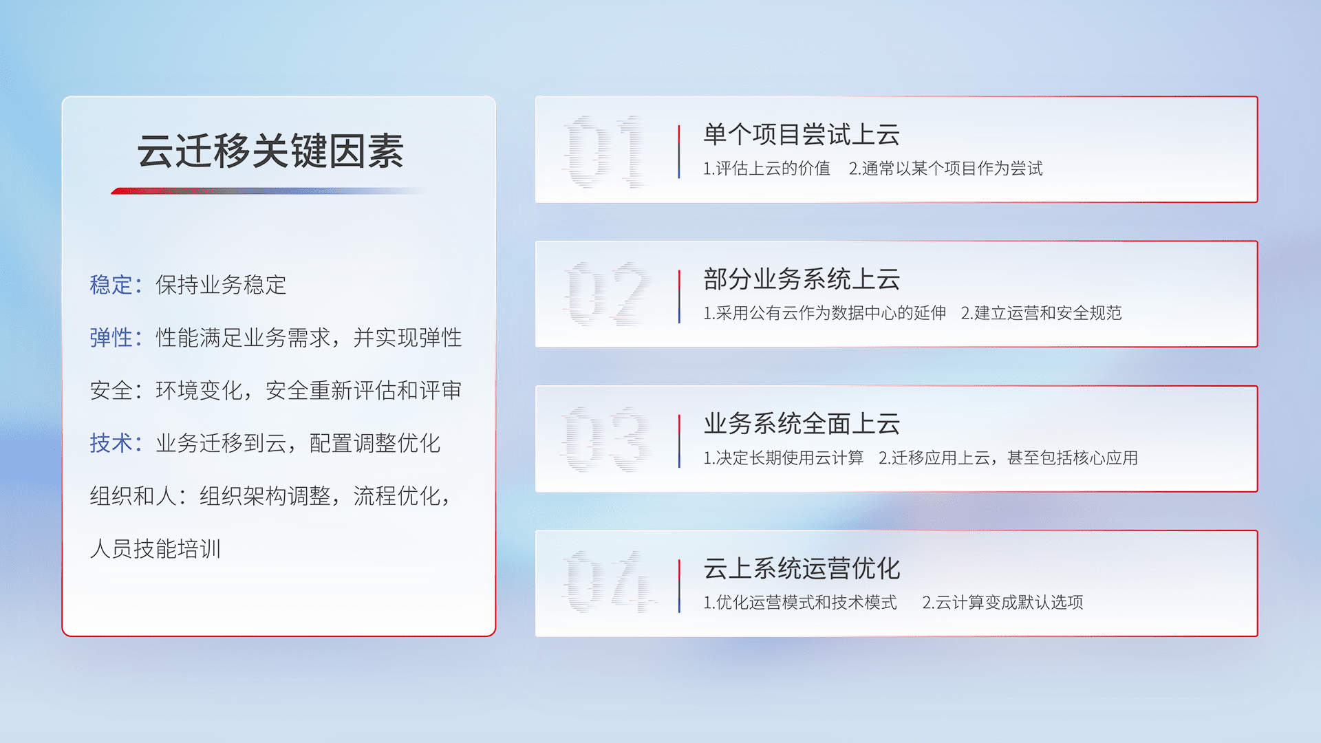 结合实际业务,,,,从规划设计、、、、云平台选型、、、云原生改造、、、数据迁移、、、、集成交付,,迁移全过程为客户识别最佳上云路径,,做好风险识别管理,,,设计网络架构、、身份权限、、、、安全审计合规、、、、操作审计、、日志审计、、、、监控告警策略、、、多站点容灾设计等,,,,对云上基础设施进行整体规划,,,,提升IT治理水平,,以满足弹性、、、、高可用、、高性能的需求。。