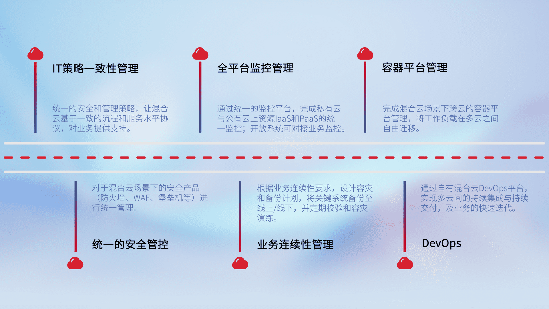 通过多云纳管,,,,以统一的资源数据模型把客户的云资源进行抽象和封装,,进而实现对多云资源的统一操作,,保障云资源管理的可靠性、、稳定性与可用性。。。。量身定制化运维内容,,,,配置、、、开发运维、、、、补丁管理、、备份、、监控、、认证和访问管理、、、审计和日常巡检等,,保障在用云过程中的可靠度,,,稳定度以及高可用率。。